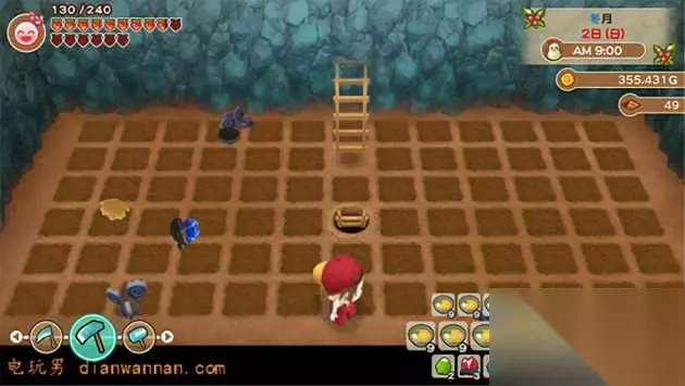 新版中比较快的下矿方法 进入一层矿场后先存档,然后只要在矿场中走一遍一般就能找到矿洞,掉落下去就看运气掉到几层,如果不满意层数可以直接读取存档,然后这一层矿洞的位置还是在原地,你只要走过去就会再次掉落下去,可以一直重复掉落直到掉落曾是是你想要的为止,这个肯定比一层层挖S/L快。 如果以矿场255层为目标,最快的就是每次下5层,需要下51次,每次体力消耗70就一共消耗3570体力,用基础的50体力药剂回复,需要72瓶,背包9个一叠只需要8个格子就可以了;实际情况可以在多方两叠体力药以防万一。我后期从202层下到255层通过矿洞真是很快,和滑滑梯一样。 至于疲劳度,在体力充足的情况下,我是没看出挖矿消耗疲劳,至少我一路挖到255层,没用任何疲劳药,都还是小红脸。 最后再说一下矿洞和时间的设定 本作在矿场中每下10层就会过10分钟,通过矿洞下矿,时间规则依然适用,但是测试过程中发现女神秘宝的效果在这过程中并没有体现,即在掉落后时间过了10分钟,但体力并没有恢复,又或者是因为需要调成当前装备才能生效?我是放在背包里,不知道是不是bug。 采矿场里除了矿石还能获得其他特别的道具及物品。 挖掘地面的话有可能会出现下面的共同道具。 建议尽快获得其中的「力量之树果实」。