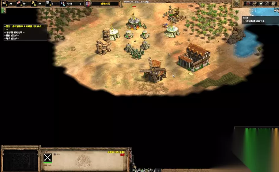开局阶段的资源管理与基地布置是后续一切行动的基础。游戏开始时,您拥有南、北两处营地,应立刻让所有农民投入工作。北营地的农民需优先收集食物并前往北面伐木,同时必须尽早派农民采集东北方向的金矿。南营地则重点保障另一处金矿的采集。首个800食物应尽快用于升级至城堡时代,这是发展经济和军事的关键前提。资源采集,尤其是食物和木材,应作为最优先事项进行处理。