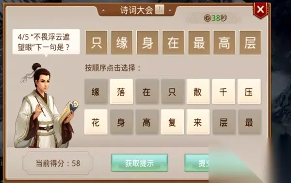 这些诗词的题目都是可以通过百度找到答案的,所以还是很简单的。 对诗词不是很熟的玩家也可以多多利用搜索,可以快速找到答案。 其中有一道题问的是不畏浮云遮望眼的下句,这道题的答案是只缘身在最高层。 但是实际上诗句还有另外一个版本,是:不畏浮云遮望眼,自缘身在最高层。这个题目属于有点争议的。