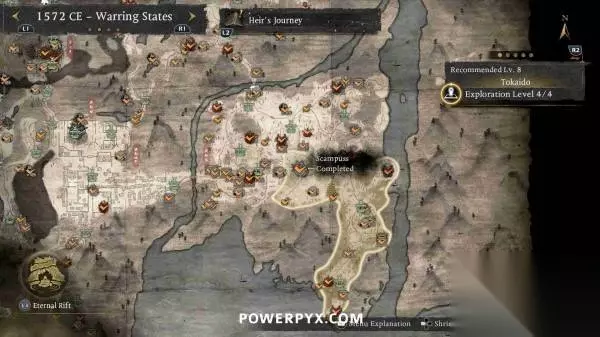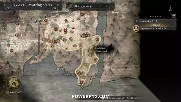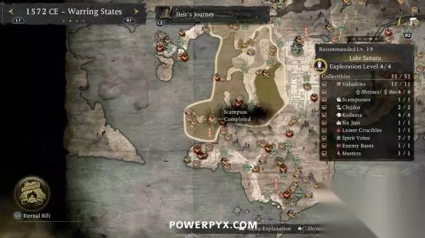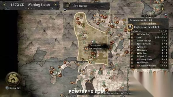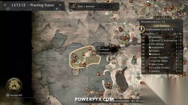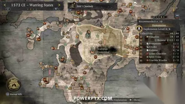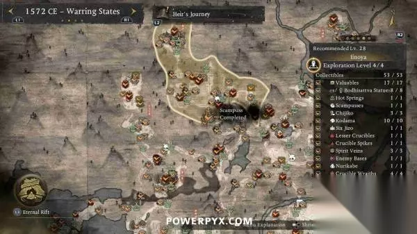 本文编译自Powerpyx,部分内容涉及剧透,请酌情阅读。 善擦是一种会发出咕噜声的猫妖,靠近就能听到音效,通常出现在路中间的神社旁边。抚摸善擦后,善擦就会跑开,需要一直追逐善擦直到它们停下,然后再次抚摸,即可获得奖励。部分善擦需要在潜行状态下(在草丛中蹲伏)追逐,否则就会受到惊吓并重置回起始位置。每只善擦都被算作一个“贵重品”收集,因为会奖励技能点。部分善擦还会提供“善擦毛球”,可以交给“久远之隙”中的“大善擦”(完成第一个地狱后解锁)。将所有毛球交给大善擦可以解锁一种忍术(角色可在短时间内变成一只巨大的善擦)。 在一个区域内通过寻找其他收集品使探索等级达到4级时,善擦的位置会以白色图标自动标记在地图上。在地图上按【R2】可以查看每个区域的收集品统计,可以对善擦图标设置标记并跟随罗盘轻松找到。 不用担心漏掉任何善擦,所有区域在通关后依然可以返回自由探索,所有任务也可以通过神社的战绘卷重新游玩。 ※为防止剧透,本文会按照时代分页,请根据每页标题翻到对应时代页面查看~ 战国 天龙川(推荐等级6) 善擦01