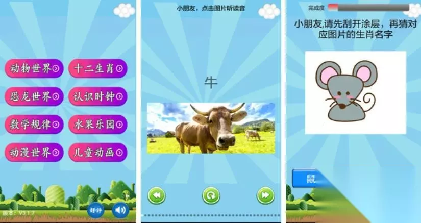 游戏通过在玩中学可以让孩子们更好的进行各种知识的学习,在这里面涵盖了八种类型的游戏,每一种游戏都可以让玩家通过不同的角度来认知动物,水果,蔬菜甚至是数学等等,并可以通过不断进行做选择,从而加深自己的记忆。当然,除了小游戏之外,还可以观赏游戏中的动画,并有一个更加深度的理解,从而更好的进行认知。游戏整体的画面虽然比较简洁,但是却更容易感知跟消化。 》》》》》#儿童乐园#《《《《《 2、《儿童游戏乐园》