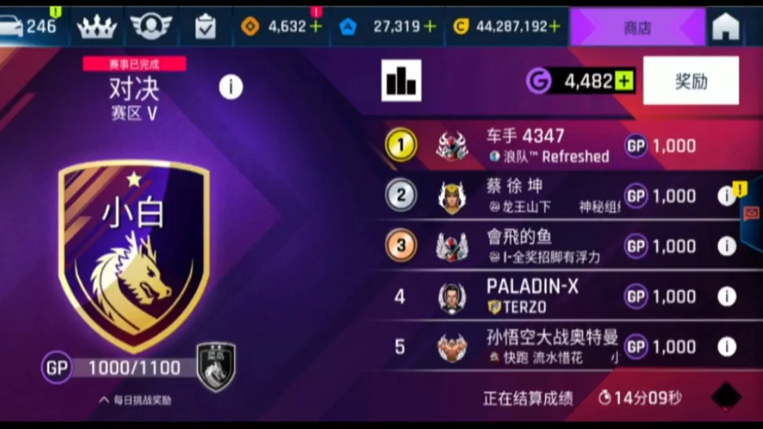 《狂野飙车9》的萌新玩家通过氪金,在游戏的五区结算中,两个号分别在两个组拿下榜一,打破他人质疑,展示了游戏内的竞技成果。