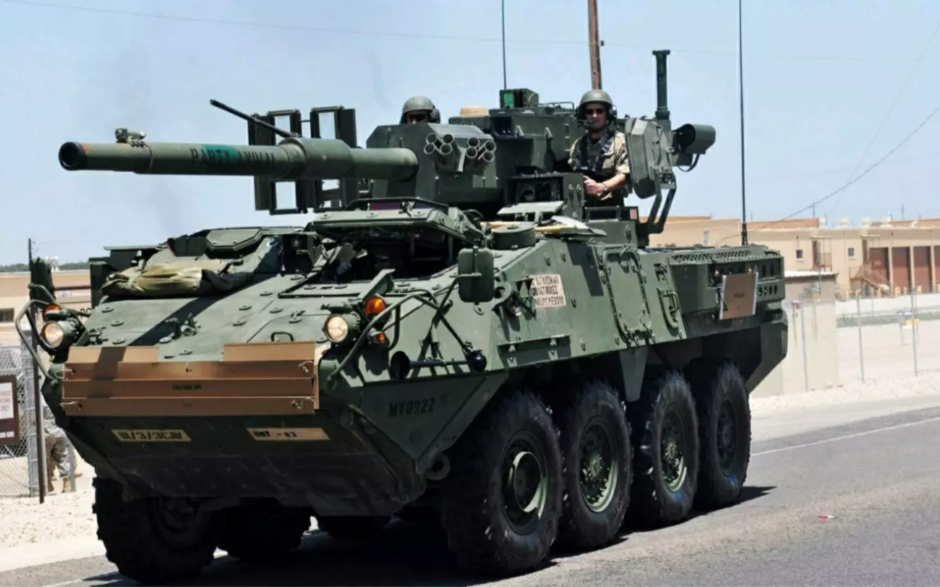 这是游戏《战术小队 Squad》的相关内容,展示了以第一人称视角操控M1128在城区机动歼灭敌军的游戏画面,呈现了该载具的作战瞄准界面与实战场景。