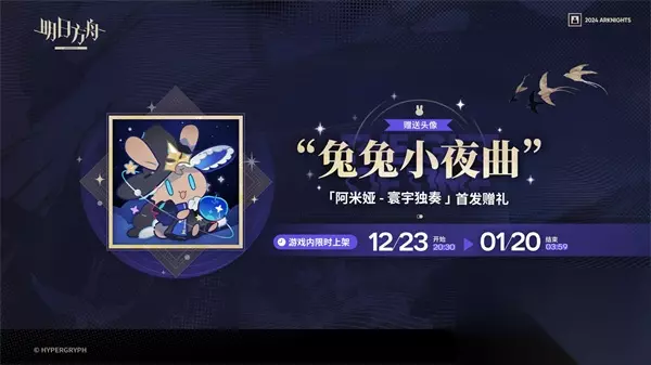 三、附加福利/限定奖励 如果你在皮肤首次上架期间购买“寰宇独奏-阿米娅”,除了获得这款美丽的皮肤外,还将解锁一款全新的头像——“兔兔小夜曲”。 活动时间:2023年12月23日20:30 - 2025年1月20日03:59