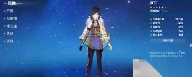 突破材料|队伍配置|天赋加点|武器选择|培养技巧 一、圣遗物推荐 绝缘之旗印4件套: 该套装提供20%元素充能效率(2件套)和基于元素充能效率提升元素爆发伤害(4件套),最高可提升75%。非常适合以元素爆发为主输出的夜兰。 2件沉沦之心 + 2件其他套装: 沉沦之心2件套提供15%水元素伤害加成,搭配其他套装可进一步提升特定属性。可选搭配套装包括: 千岩牢固: 提供20%生命值加成,提升夜兰的元素爆发伤害。 宗室之仪: 提供20%元素爆发伤害加成,进一步强化爆发输出。 绝缘之旗印: 与4件套相比,降低了对元素充能效率的依赖,可以更灵活地调整词条。 二、主词条选择 时之沙: 生命值百分比 或 元素充能效率 (根据套装选择和配队调整) 空之杯: 水元素伤害加成 理之冠: 暴击率 或 暴击伤害 (根据自身面板调整) 三、副词条优先级 优先选择暴击率、暴击伤害、生命值百分比和元素充能效率。 在保证足够元素充能效率的前提下,尽可能堆叠暴击率和暴击伤害,以最大化输出。