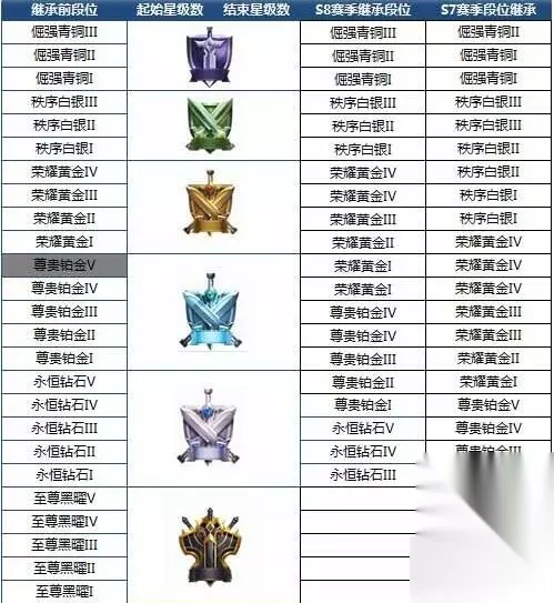 S8赛季即将来临,在S8赛季开启之后,玩家将迎来新一批的段位继承,此前的段位将会依照规则递减,下面就是王者荣耀S8赛季的段位继承方式,一起来看看吧。 段位及段位继承相关调整 官方调整内容: 1、钻石以上增加新段位—至尊黑曜 2、青铜白银不掉段,黄金铂金段位将略微掉段 3、高端段位:钻石以上段位保持原有的掉段幅度,尽量小的影响到大家的升段速度。同时,铂金阶段每个小段位5颗星将会降至4颗,白银每个小段位4颗星将会降低至3颗,铂金的5个小段位划分也将降至4个小段位 4、新增段位继承:整个赛季无排位,直接下降为青铜三,S8赛季根据上一次排位段位进行跨赛季的段位继承 详细S8赛季段位继承规则: 1、S8普通段位继承规则