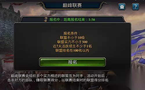 【巅峰联赛是什么】 巅峰联赛将随机组织多个符合报名条件,且实力相近的联盟互为对手,活动开启后,可前往目标王国击杀对方部队,赚取联赛积分,以联盟结束时候的联盟得分排名,并发放对应丰厚奖励。
