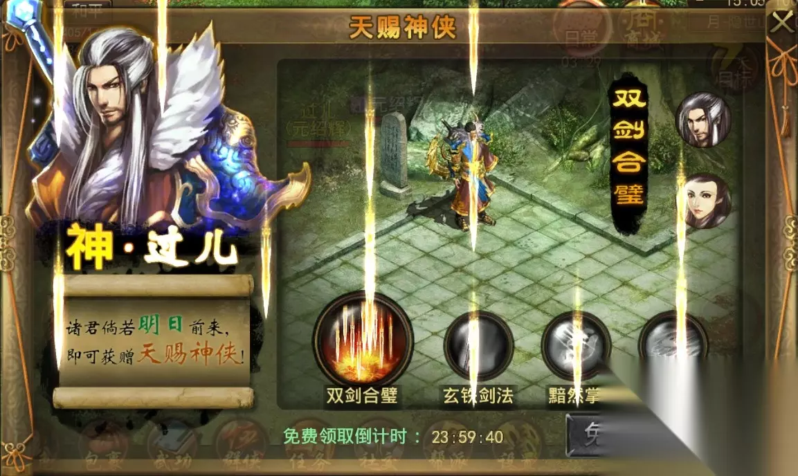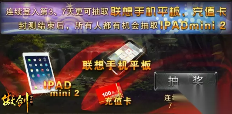 傲剑封测活动: 连续登陆游戏抽取联想手机平板、充值卡和ipad大奖。个人等级排行、帮派等级排行等获得超量游戏道具大奖、还有每日礼包领取。什么神装、神器都不是梦想!封测开启后,还可以获得神级武侠—神·过儿。