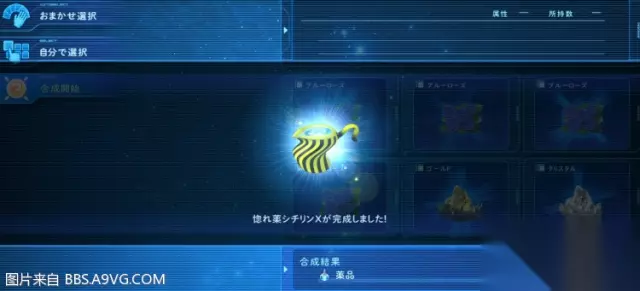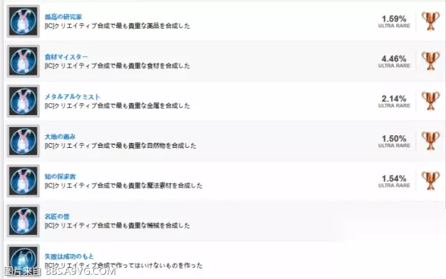 Creative合成类奖杯:首先理解合成是根据合成选择材料的品质/不纯物/合成结果这3个属性来决定最终产物的. 品质: 每个材料的品质. 根据商店售价或者稀有度来判定. 不纯度:当添入的材料2种以上类别不同.属性值较低的材料就会被添加到不纯度里(根据品质添加).比如クリスタル属于魔法类ゴルード属于金属类.クリスタル属性值比ゴルード高.ゴルード就会被根据属性值添加到不纯物属性值里. 合成结果:根据全部投入的材料.计算出属性值最高的材料.决定最终合成产物的类别.比如之前说的.クリスタル和ゴルード各一个.クリスタル属性值高过ゴルード.则合成结果取属性值高的クリスタル既类别属于魔法类. 理解以上合成规则.然后熟记每个类别属性值最高的材料即可获得你想要的结果.这里给大家总结一下比较每个类别商店有卖的高级材料. 金属类:ゴールド(隐藏迷宫惨太) 魔法类:クリスタル(隐藏迷宫惨太) 药品类:煉金水(行商ラドル) 自然物类:熟成ポット(沙漠城) 料理类:ショートケーキ(料理制作) 機械类:マイクロガジェット(飞船上) 然后回到奖杯上.奖杯对应需要的物品和合成配方: (装备类ムーンナイト是必须.隐藏迷宫boss掉) 孤高研究家:奇迹的灵药(药品类 品质50 不纯0) 食材master:極上カレー(食品类 品质50 不纯0) メタルアルケミスト:男主最强武器魔剑或黄毛最强武器(ムーンナイト+金属类 品质50) 大地の恵み:アンヌ最强武器(ムーンナイト+自然物类 品质50) 知の探求者:女主最强魔杖&魔女最强法球(ムーンナイト+魔法类 品质50) 名匠の誉:舰长最强弓(ムーンナイト+机械类 品质50) 失敗は成功のもと: 这个能满足的物品很多. 任意类别品质10-20 不纯50 都有一定几率出现.配方大家可以发挥想象.前面的媚药配方也可以合出这个奖杯.