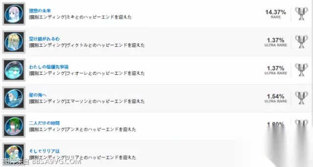 个人结局奖杯 非常需要注意的是:通关后结局是根据除了リリア之外其他队友对男主好感度来分结局.只有其中之一好感度最高的队友才有结局.就是说一次通关只能拿一个好感度最高的队友结局+リリア结局(リリア结局属于附送品). 这里给大家提供一个最简单区分好感度高低的方法: 在场景上按X加速跑时跟在男主后的队友顺序依次按照好感度高低来排列. 关于如何无视PA操作好感度一周目获得多结局:使用2种操作好感度的媚药.一种是好感度down的使用调合技能可以制作材料简单.另外一种提高好感度的需要的材料比较稀有推荐合成.媚药配方: