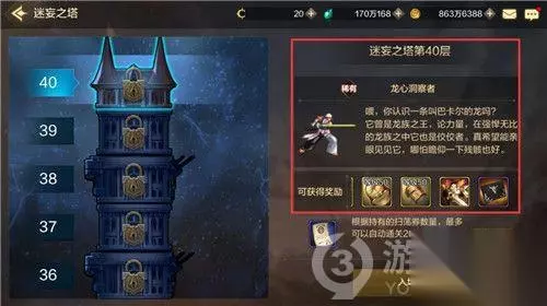 参与等级与奖励说明 当角色到达17级时,迷妄之塔副本就可以进入,由于等级和装备的原因,此时挑战迷妄之塔难以到达很高的层数,可等到等级高装备好时再挑战,往更高的层数努力。 通关1-4、6-9、11-14、16-19、21-24、26-29、31-34、36-39层时,都会获得神器装备和一定数量的金币奖励;在通关5、10、15、20、25、30、35层时,可获得一定数量的泰拉;在通关第40层后,有几率获得史诗装备和深渊派对邀请函。
