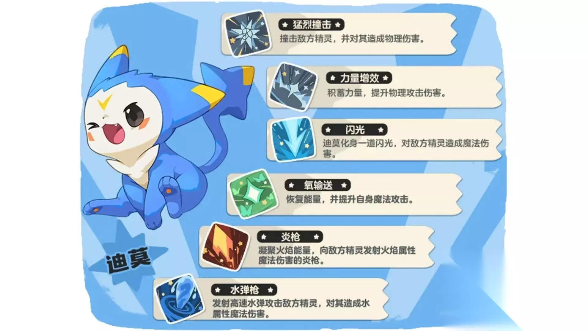 他的主进化链分为了三部分,第一部分是圣光迪莫这是他的第一次进化形态,拥有了非常强大的光系技能,是很多玩家心中的一些经典的形象。第二种是皇家圣光迪莫,他是在第一种基础上做了一些净化,那么它的属性和技能都会得到提升,所以也是游戏当中的非常强力的宠物。第三种是觉醒迪莫,他是迪莫的觉醒形态,拥有了非常高的种族值和强大的技能,所以是很多玩家追求的一种状态。