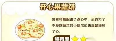 所需材料:2马铃薯+2青瓜 菜谱获取:SMC等级达到52级奖励 马铃薯是农场主56級才能解锁的种子,前期可以通过购买礼包的方式来获取。 食谱介绍:开心果蔬饼制作时间1H,售价1008摩尔豆,利润可观,而且可以不消耗食材。将素材搭配进了点心中,尼克为了不爱吃蔬菜的小摩尔们也真是操碎了心。 温馨提示 1.这个料理要求厨师等级达到52级才能解锁和制作,对于目前玩家而言想要解锁是很有难度的; 2.前期想要做出流行菜难度比较大,玩家们游戏过程中不必刻意追求。