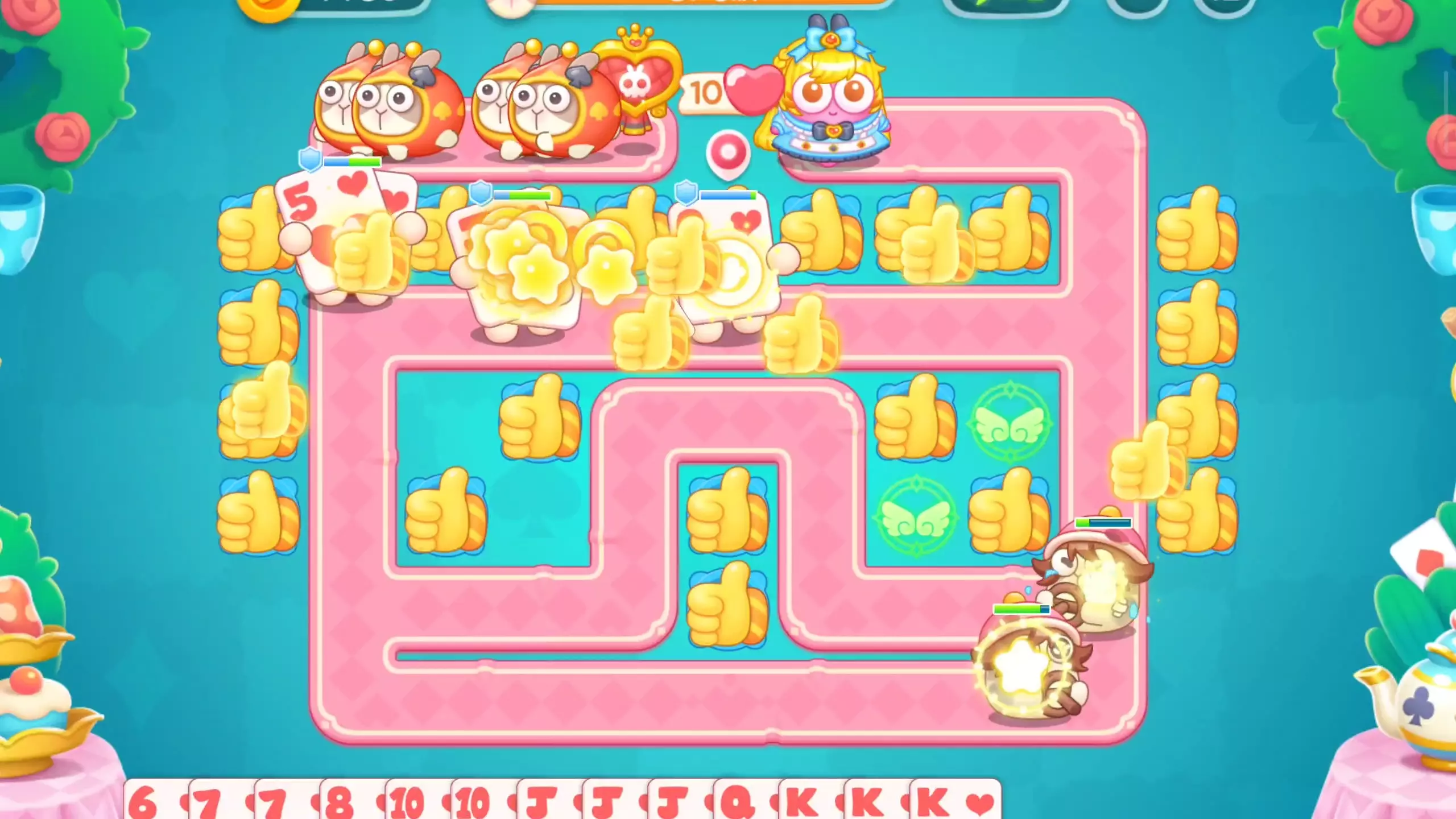 第5关出现新敌人:纸牌兔,移速较快,护盾较厚,需要建造高伤害炮塔实现快速破盾将里面都呆兔释放出来 第6关出现新道具:扑克牌,根据纸牌兔上面的花色选择大于该纸牌的花色拖动纸牌到纸牌兔上从而使纸牌兔快速破盾,注:纸牌仅对纸牌兔生效。