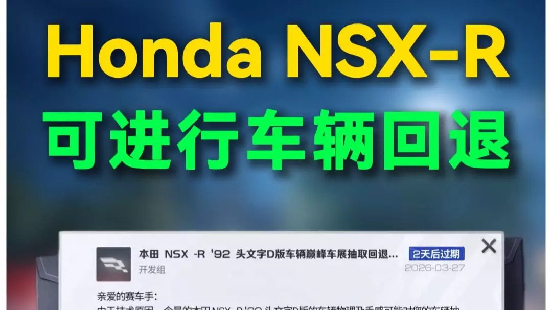 《巅峰极速》的本田NSX-R '92头文字D版因技术问题出现车辆物理手感、六维图与强度不匹配等bug,官方推出回退方案,符合条件的玩家可在指定时间申请退回车辆并返还抽取道具,不少玩家陷入是否退回的纠结。