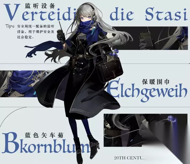 之后是柏林以东,她也是一位很老的角色了,距今已经很久了,这位角色拥有一头灰色的长发,穿着一身德式制服带着一个监听器,她的调香为矢车菊,她是一位善于倾听的角色,她的监听器可以听到人们的心声。另外她还是一个神秘学家,她会前往神秘发生地寻找真相。