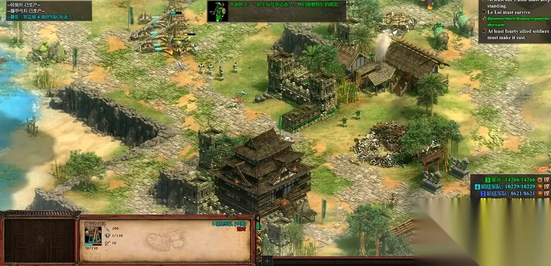经济运营需保持稳定木材和黄金供应,确保炮舰生产线不间断。初期可分配少量村民采集岸边资源,避免过早与陆地敌军交火。当敌方兵营被摧毁过半后,战局将大幅简化。注意保护船坞免受敌方投石机袭击,必要时用轻骑兵吸引火力或提前清理威胁单位。