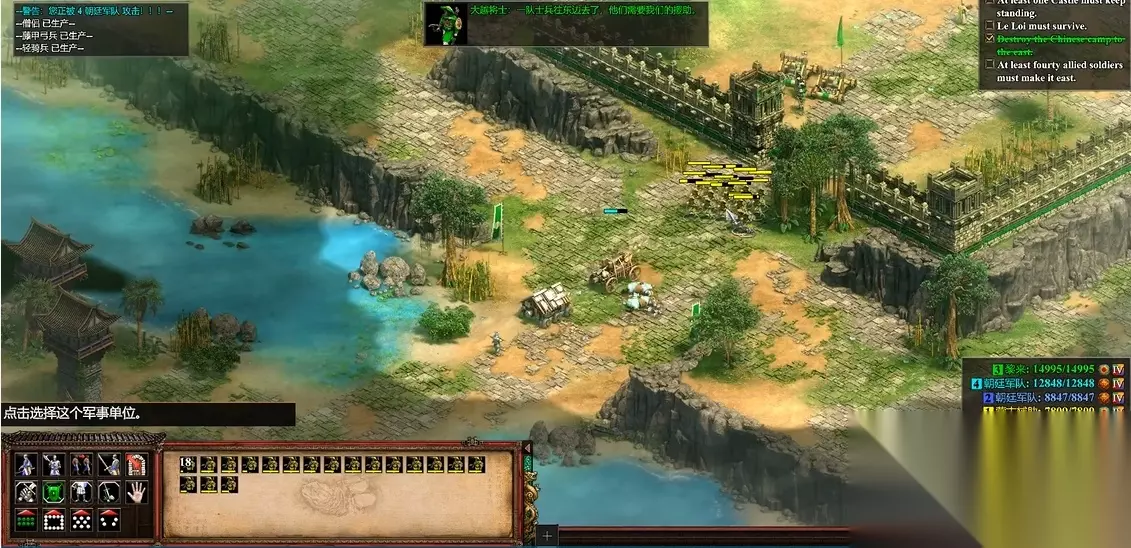 越南战役第二关的核心思路是利用炮舰战术从东南浅滩突破敌方防线。开局迅速派遣村民前往地图东南角寻找浅滩区域,此处箭塔射程存在盲区,可安全建立船坞。优先生产炮舰配合少量战舰控制水域,集中火力摧毁敌方城堡和码头,削弱其海军反击能力。陆地部队以轻骑兵为主,配合黄金资源持续补充炮舰,逐步推进至敌方腹地。