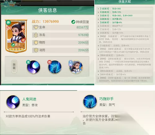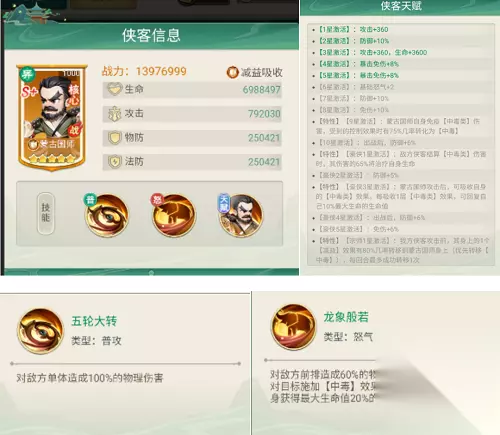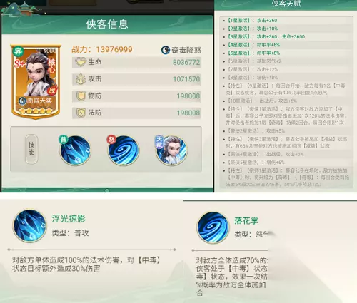 ④南宫天奕 南宫天奕是这支队伍中核心的毒伤引爆手,他可以对【中毒】状态下的敌方侠客打出增伤、回怒、追击、降怒的组合拳,让敌方苦不堪言~ 详细说来就是,南宫天奕会对【中毒】状态的敌方施加额外伤害,越多敌方侠客【中毒】,他在一定几率下恢复的怒气也越多。在我方侠客成功施加【中毒】效果后,南宫天奕还能进行一次追击并施加【奇毒】状态,给敌方造成伤害的同时还有一定几率降低敌方1点怒气。
