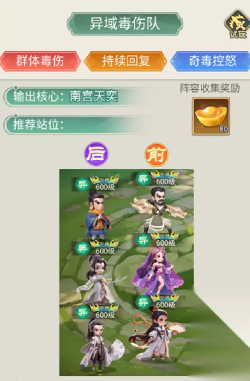 3、阵容锐评 相比其他队伍的打打杀杀,异域队伍主打一个折磨,依靠不断叠加的【中毒】效果来打大量伤害,队伍核心的南宫天奕还能将【中毒】升级为【奇毒】,造成伤害的同时控制敌方的怒气,当番僧带着他的生命光环以及毒伤增强到来时,就能让对手在升级的“折磨”中品尝到失败的滋味。