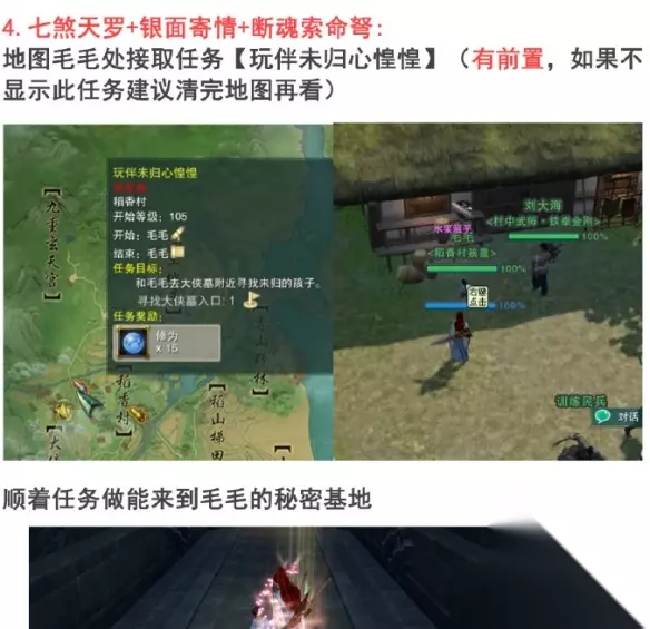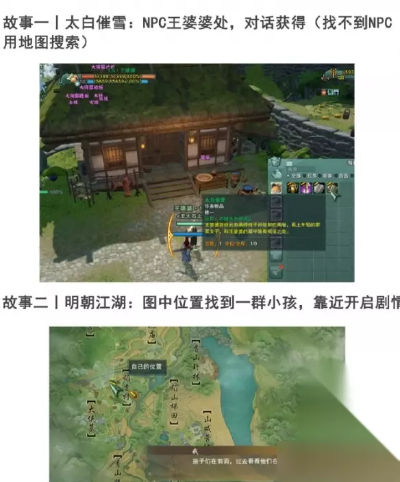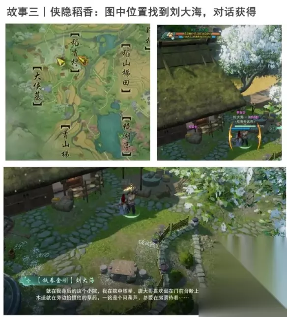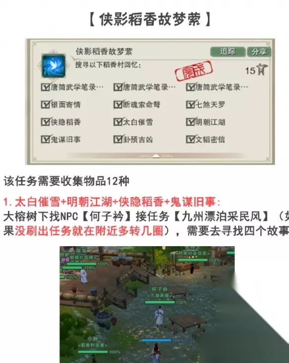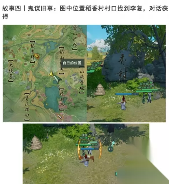 剑网3手游侠影稻香故梦萦任务攻略 1、太自催雪+明朝江湖+侠隐稻香+鬼谋旧事。 太自催雪:NPC王婆婆处,对话获得。 明朝江湖:找到一群小孩,靠近开启剧情。 侠隐稻香:找到刘大海,对话获得。 鬼谋旧事:稻香村村口找到李复,对话获得。