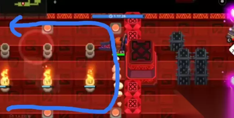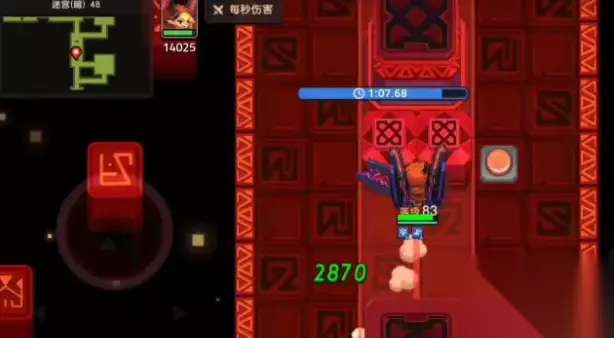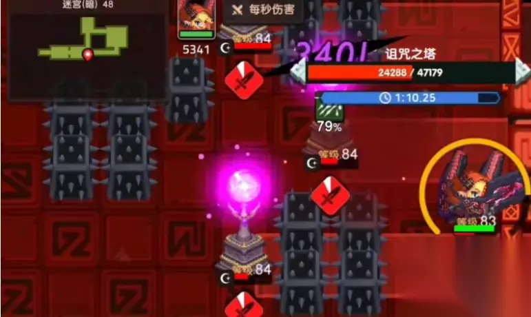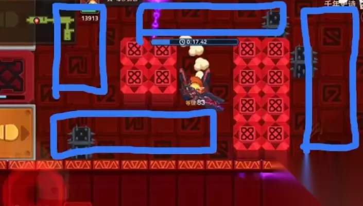 3、第二个房间:BOSS是牛头人,唯一需要注意的攻击就是散射火球,由于可移动空间小,几乎没有办法从间隙躲掉,所以最好在牛头人普攻后拉向墙角,向反方向逃跑。 (红条范围非真实范围,实际上摸不到后面,而射程也远不止如此) 4、第三个房间:紫球与动刺,该关考验的是身法。宁可被刺扎到,也不要撞紫球。(两下基本秒)判定点只有两个球体。 虽说链子没伤害,但是从中间穿过去太冒险了,这里建议贴右墙走。 5、第四个房间:一堆小怪,但是两个红帽地精的伤害要高一点。尽量不接连锁,纯技能控。 6、第五个房间:本关需要拆除两个激光塔。最上方两侧有无伤害的击退弹幕。按下按钮后迅速走到上面的门处,等待弹幕飞过按钮后迅速前往下一个门后。只要被弹幕擦到一下,立刻停止向前,走到两侧顶着弹幕走,等激光攻击完后回到门处(这时候基本就没多少时间了) 到达塔处需要高输出迅速清理,否则还是得顶弹幕等一段时间。 需要注意的是,发射弹幕的两尊石像有碰撞体积(撞到会弹回)撞到石像就是浪费时间(还会被往下打一段距离)可能导致没有足够时间清理下一个关卡怪物。 7、第六个房间:一定要打,之前在弹幕处消耗的时间完全不够打通后面两个房间。牛头人注意事项同第二个房间。 这里需要留住连锁,给下一个房间的怪物。 8、第七个房间:开局清小怪,打出连锁秒掉后,等待激光攻击结束清塔。左侧紫球按逆时针转动,右侧紫球按顺时针转动。 9、第八个房间:跑步,如果输出快的话,这里就有容错时间,否则必须一遍过。开局按下按钮后绕过刺,一鼓作气冲到终点。动刺活动范围如下。都按照顺时针运动。 门有时间限制,只要关上了立马踩跳板回去。