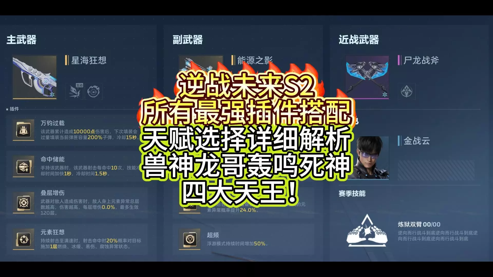 这是《逆战未来》S2的避坑指南,介绍了当前版本武器强度排行,龙哥兽神登顶,死神强度下滑,蝎王成热门选择,还展示了武器插件搭配,比如飓风之龙的专属插件等内容,帮助玩家选择合适武器与插件。