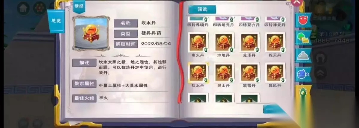 5、坎水丹配方:中量土属性 大量水属性;例如镇地根x4 萍叶心x5 今朝露x1。