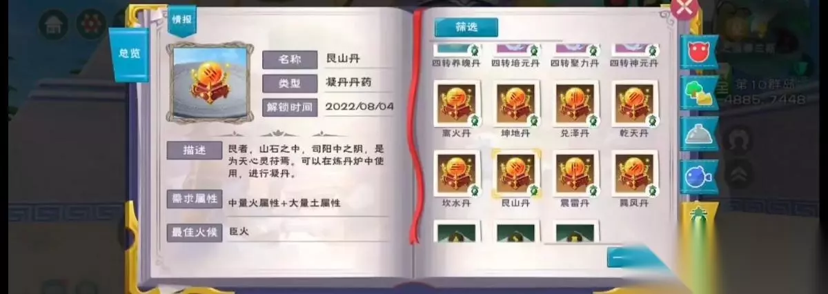 6、艮山丹配方:中量火属性 大量土属性;例如镇地根x7 火芝x1 火芝盖x1。