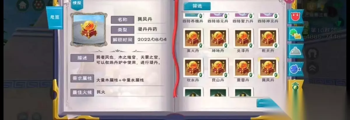 8、巽风丹配方:中量木属性 大量水属性;例如嫩笋芽x7 今朝露x1 萍叶心x2。