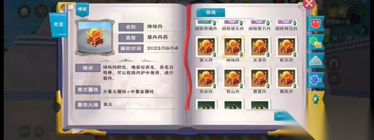 2、坤地丹配方:大量土属性 中量金属性;例如镇地根x5 幻蕊瓣x2 无尘果x1。