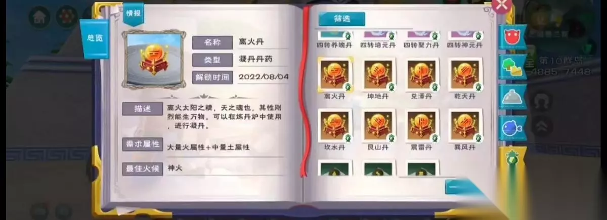 创造与魔法八卦丹配方 1、离火丹配方:大量火属性 中量土属性;例如火芝 x8 地根x2。