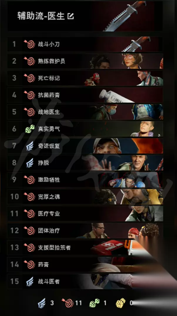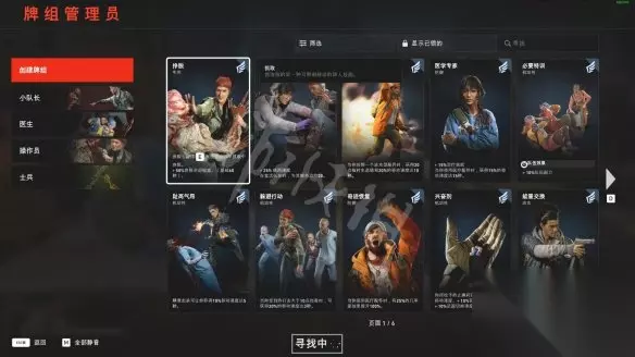 5、一些有好用的通用卡牌 如上文中所提到的,根据自己的玩法来打造卡牌相当重要,但也有一些所有牌组都能用上的通用卡牌。例如「激励牺牲」这张卡能够在一名队友致残时,给其他队友在 10 秒内治疗 25 点生命值。 不仅抵消了一些致残带来的负面影响,也可能是关键时刻帮助队友挺过艰难战斗的必胜法宝。另一张不错的卡叫做「死亡标记」,能够高亮出特殊灾变者,全体队友对其造成额外 15% 伤害。所有玩法基本都需要玩家标记出特殊灾变者,所以这张卡的泛用性相当广。 6、有负面效果仍然值得一带的卡牌 就像上文中提到的「多余小包」卡,许多卡牌虽然有着明显的负面效果,但仍然值得一带。其中一张叫做「肾上腺素激增」的卡牌虽然让你的耐力恢复减少 75%,但能让你的耐力增加 100%,击杀敌人还能恢复耐力。虽然看起来付出的代价很大,但实际上搭配适当的牌组,你能一边杀敌一边高速机动,约等于没有负面效果。 另一张「振奋人心的演说」将停用手榴弹、燃烧瓶等进攻型道具,但换来了 150% 的急救速度和急救时所受伤害减少 50%。鉴于游戏中的急救时间相当长,在过程中可能受到许多潜在伤害,这个卡牌能大幅提升某个玩家的治疗能力。虽然无法使用进攻性道具,但这也可以通过队友来弥补。 7、卡牌顺序也很重要 最后,一定要知道卡牌在牌组中的放置顺序影响极大。牌组上方的卡牌会在游戏早期出现,最上方的一张就是你初始免费获得的那种卡牌。一定要仔细规划好在游戏的前期和后期分别都需要什么样的卡牌。如果是玩法核心相关的卡牌最好置于牌组的上方,而对整体玩法影响不大的增益类卡牌建议放在靠近底部的位置。 接下来为大家带来全职业全流派的卡组作业。 医生定位是一位极强的辅助职业。 属性为:+治疗奖励(每局给每位队友加血25点)。 +20%治疗效果。 +25%团队伤害抗性(仅小怪有效)。 是困难和噩梦中及其重要的角色,初始武器为冲锋枪MP5,手枪贝雷塔M9。 辅助流医生