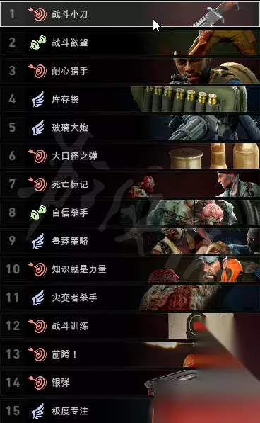 核心卡牌解析: 1.战斗小刀 推击变为—把快速的刺击小刀,非常适合医生职业后排保护。本身耐力较低,搭配上冲锋枪和手枪的和动性,清理小怪速度非常快,近身秒天锤弱点也是极快,建议带上。 2.熟练救护员 使用医疗时给目标加20%血直到关卡结束,一张前期必带神级卡,关卡开局直接拿几瓶超便宜的止痛药给队友加上20%血。 3.死亡标记 标注的特感高亮并且全队对这个特感增加10%伤害,又是一张神卡,前期就带上完美适合辅助流医生,标记完的特感全身形态红色高亮非常明显,并且可以看出特感的动作,非常有用。 4.真实勇气 当你受到15点以上伤害时,每秒恢复8点血量,持续5秒,神卡之一。中期带上非常好,被大锤砸被特感炸都会回血。 5.激励牺牲 当一位队友致残后,其他队友在20秒内恢复25点生命值。神卡之一,中期必带。 6.宽厚之魂 治疗一名队友对自己加50%治疗,直接省一半治疗包,神卡。 7.医疗专业 急救包和电击器额外回复15血,并且恢复一次倒地续命次数,这张卡高难度后期十分重要,一次续命次数十分宝贵。 8.战斗医者 +50%使用速度,复活队友为其增加20点血量,后期救命神卡,在几个人都倒了的混乱局面中,甚至可以将所有人全救起来,速度很快,救场一流。 高单点伤害远程狙击卡组