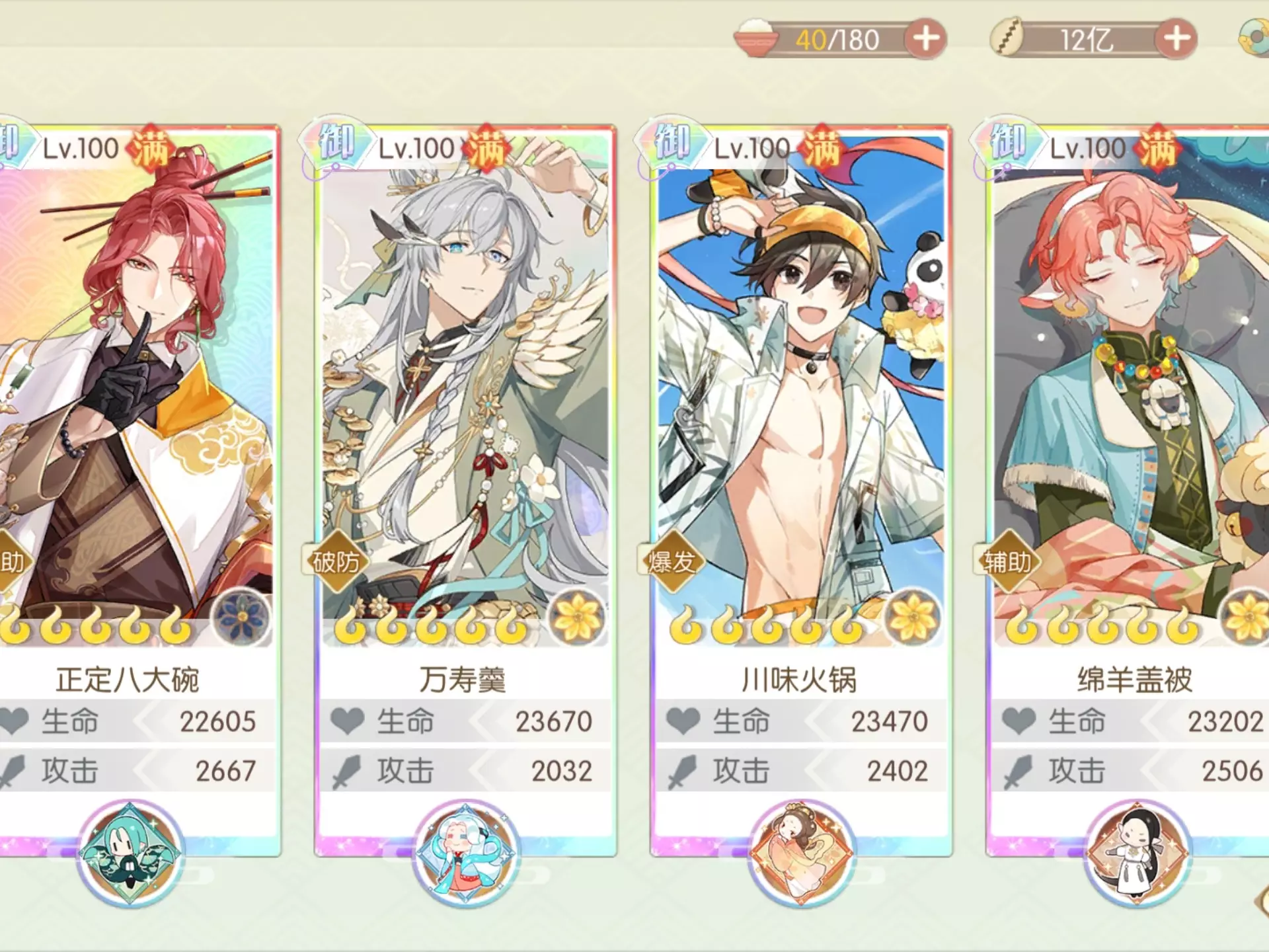半夜打的,大部分人应该都打完了,排名应该比较固定了,全都是就业比较广的食魂,完全可以开满花(我没开满花是因为调料不够) 周末boss想要高伤害,一是开花,二是膳具 这个阵容百仁不开花也可以打,我记得我上周没开花好像是80万伤害左右,而且用的还是珍膳(部分还没有满级)