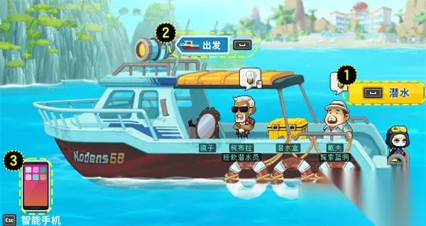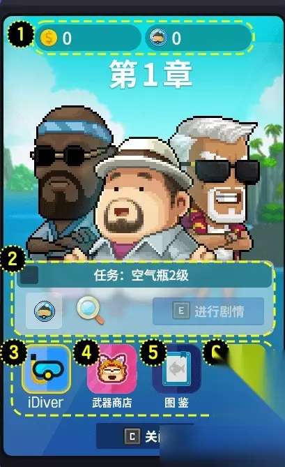 智能手机 1.当前持有的金币与潜水员代币。2.完成章节所需任务说明、任务奖励、进入剧情。3.IDIVER :可升级空气瓶、潜水服、装载箱、脚蹼等探险装备。