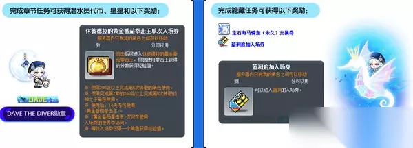 冒险岛探索蓝洞详细教程 活动时间:2025年9月10日9点到2025年11月25日23点59分 活动对象:101级以上角色,与完成剧情任务第2章的神之子角色 活动内容:左侧图标处参加拯救潜水员活动,戴夫和伙伴们在蓝洞遇难后来到了冒险岛世界金海滩,帮助戴大一行人顺利归乡,筹备班乔寿司金海滩店赚取小艇的修理费用吧! *章节剧情奖励、蓝洞生物收藏、潜水币商店等活动截止时间至2025年10月14日23点59分。 潜水准备: 通过消灭1000个等级范围内怪物,完成拯救潜水员任务和探索准备,找到NPC戴夫进行潜水准备,按照顺序进行探索蓝洞和班乔寿司营业活动。 1.潜水:在梯子上按住空格键可开始探索蓝洞 2.出发:在船头可以返回原本的位置,或前往班乔寿司金海滩店。3.智能手机:使用智能手机可查看潜水装备、武器商店蓝洞生物图鉴、代币商店以及章节任务。
