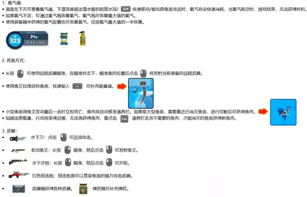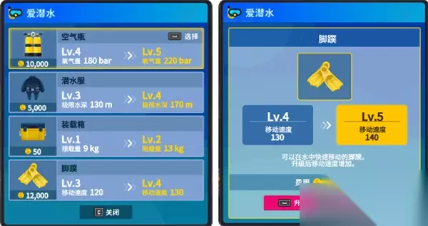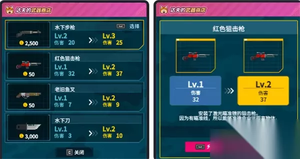 4.武器店:可升级水下步枪、红色狙击枪、老旧鱼叉、水下刀等武器装备。
