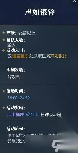 逆水寒手游是一款正在风靡的国风武侠手游,游戏中融合了多种精美的画面和真实的战斗体验让人沉迷其中。游戏里也有很多的任务需要玩家去完成,今天小编给大家带来的是游戏中声如银铃奇遇任务攻略,有兴趣的小伙伴一起来看看吧。 逆水寒手游声如银铃奇遇任务攻略 谨言童子位置:汴京(640,615) 每天都会有新的任务发布,每天18:00-23:59可以完成任务。