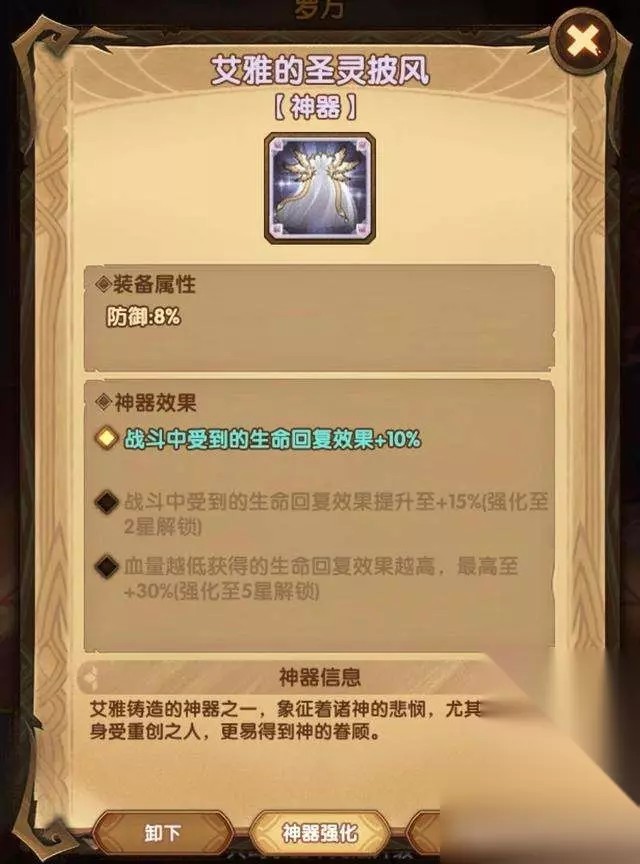 一、装备属性 防御10% 二、神器效果 战斗中受到的生命回复效果+10%。 战斗中受到的生命回复效果提升至+15%(强化至2星解锁)。 血量越低获得的生命回复效果越高, 最高至+30%(强化至5星解锁)。 三、神器信息 艾雅铸造的神器之一, 象征着诸神的悲悯,尤其是那些身受重创之人,更易得到神的眷顾。 四、简评 横向对比三个防御型神器,披风加防御最多。神器效果非常适合可以自己回血的角色。 适用于坦克,前排(大树,豹女,海王,亚瑟,生化人,羊头、狮子都能自己回血) 。