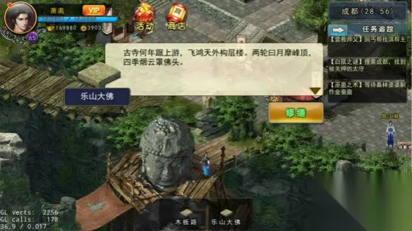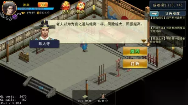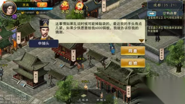到成都府衙找申捕头(35,21)对话,要想知道白鼠越狱需要花费6000铜板申捕头才会告知你他的猜测,那必然答应了,得知线索后,来到刘府找刘员外(32,8)打听陈太守为人,刘员外很敷衍的告知陈太守当然是好官,然后就着急送客,再来到陈宅找陈庸打听陈太守为人,陈庸讲述着这两年成都府衙发生的一些事情,得知很多人都被抓进地牢,只见进不见出,最后到李现治(28,53)处打听陈太守为人,李现治告知之前每年都要给陈太守治病,这两年不可治愈的病不再需要治愈了,而且发现他原来的一块儿伤疤不见了,通过以上人打听,猜测这个太守不是真的,然后在江湖上寻找真的太守,来到快活林金凤楼找孙大娘打听易容名册,但孙大娘可不做亏本买卖,需要帮其找回潜龙,随即来到嵩山(10,78)找到潜龙,发起战斗,如去的不及时,潜龙就会逃到其他地方了(具体潜龙逃窜位置:沧州5,43华山31,41嵩山9,83全真25,17),成功后孙大娘把易容手册交给了你,这真陈太守的确是一个冒牌货,回成都府衙找陈太守对峙,陈太守不认账,只能用武力解决喽,打赢后一把撕掉了陈太守面具,果真不是真太守,得知是东厂人在背后指使,并且各大门派有险,先把假太守关起来,获得暗卫腰牌一个,先去营救少林,到(23,25)遇到脱兔,战斗胜利,获得暗卫腰牌一个;然后到峨眉(26,22)遇到蟒蛇,打赢后获得暗卫腰牌一个;最后来到武当(28,34)遇到天马,打赢后获得暗卫腰牌一个;回成都地牢审问假太守,假太守只知道真太守还活着,到(30,49)找到郑三钱怪事一桩,这两年好像有人出入乐山大佛,到乐山大佛(28,56)搜索,用20个铁木修缮后,搜索进入洞口,(7,22)发现真太守,中途发生打斗,胜利后救出陈太守。在乐山大佛密事内,右手边有一副骸骨,参拜9次左右会听到有异响,后来到(18,26)处探索,获得鱼肠断剑。