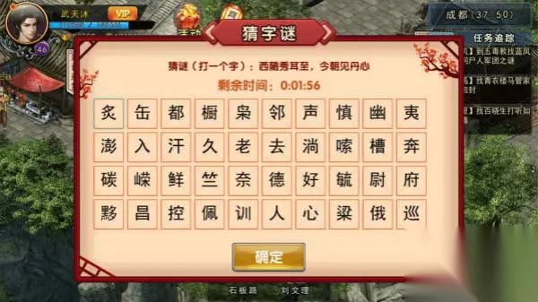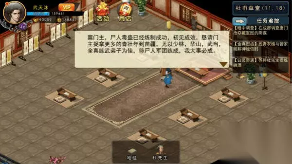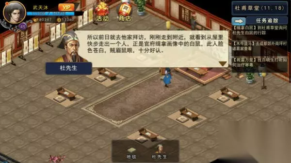 这白鼠又说成都太守不是好东西,这世道也太乱了吧,管不了那么多,先带回去再说,结果报告完还是没能得到唐傲天的信任,没办法,在成都去找找线索。 帮助唐依雪抓小白灵,到成都郊外农田旁可以找到,如果第一次没抓到可能会在成都和成都郊外的几个点随机出现:包括成都郊外村长家房后面(22,7)、武侯祠后面(38,30)、成都(21,33)、(29,11)等地,抓到后唐依雪给你一封无字的信,到杜甫草堂破解此信,但是身子虚弱需要找大夫医治一下,找到成都李现治大夫,得知多人患病,需要少林的大还丹配玄叶草才可以,但是前几日玄叶草全部被黑虎门人收购,黑虎门内账房先生处可以买到,10万铜币10个,家里有矿的可以买一下,没矿的还是来到成都郊外找船夫打听下怪事,有人偷摸往河里倒东西,在此蹲守一晚,捉拿黑衣人