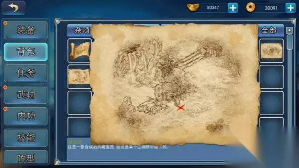 柳如是:送鲜花,隔一段时间再去送下一朵,一共送7朵鲜花后,获得残缺藏宝图; 杜秋娘:5个红蓝胭脂换残缺藏宝图; 集齐三块残缺,合成完整地图,此地为成都郊外(5,27),需要铁锹,得到天魔功;