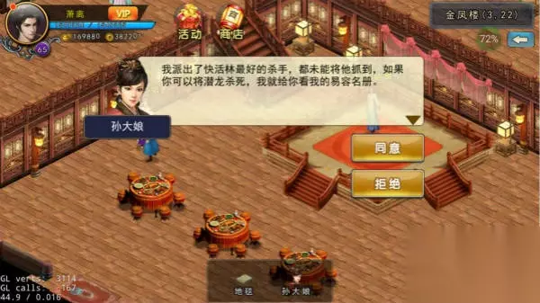 赶紧通知四大门派的掌门,小心为上;此事事关重大,牵扯到五毒教,前往五毒教查看! 支线: 过完洛阳主线一段时间后,去洛阳金刀门找洪娇打听神秘刺客,随后找小渔村船夫打听,得到神秘刺客就是阿星,帮助阿星恢复记忆。去洛阳药铺打听失魂症,回来找阿星,喝杏花酒20次,弹笑傲江湖琴谱20次。(笑傲江湖琴谱获得:去沧州青楼打听失踪小红,然后去洛阳郊外杨村和翠花对话,提供百年灵芝X2,得知强盗在洛阳,去洛阳青楼二层找到小红,替她赎身,和青楼老鸨对话,得通过朊大龙同意,在洛阳找到朊大龙(40,32),开打,赢了后去青楼找老鸨赎回小红,得到笑傲江湖琴谱),阿星恢复记忆后,把好消息告诉洛阳金刀门洪娇,然后再回到小渔村邀请阿星入队,阿星告诉你他以前是快活林杀手,由于任务失败,被放弃了,需要去快活林金凤楼找孙大娘同意,孙大娘提出两个要求选一个就好了,第一个要求需要铜币20万,个人不建议,土豪大佬随意;第二个要求是杀死附近40个野怪,感觉可以边升级边完成任务挺好的,做完任务后,去找阿星入队。