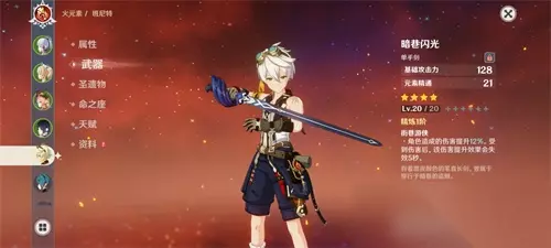 3、暗巷闪光 暗巷闪光,这把武器可以在卡池当中抽取到,是全四星武器当中最高的攻击加成的武器,可以给班尼特提供超高的辅助攻击力加成的效果,但因为没有充能所以圣遗物压力会有些大。