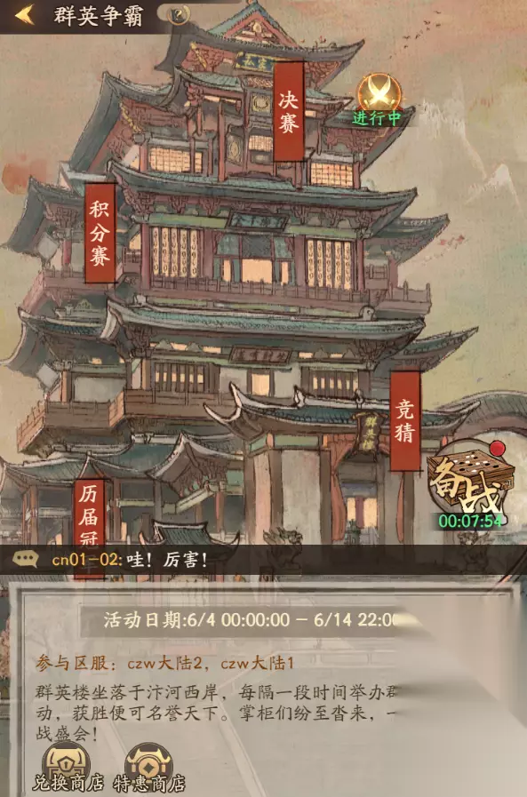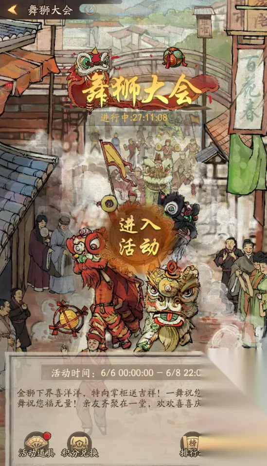 v 新增活动:舞狮大会 1、使用不同活动道具可以参与舞狮,并获得活动积分和奖励道具 2、排行榜奖励分为个人榜和商会榜,排行榜奖励需要手动领取,无邮件补发 3、未使用道具会在活动结束后自动转换为积分,积分不计入排行