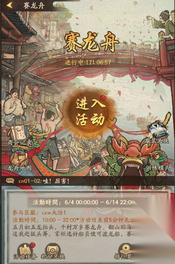 v 新增夏日祭活动:赛龙舟 五月初五龙抬头,千村万乡赛龙舟。翻山蹈海人声沸,你追我赶拔头筹。掌柜选好船员便可渡龙船,赛龙舟! 1、新增美女服装【采诗官-端午寻诗】。 2、活动开启后,身份10级以上的掌柜即可参与赛龙舟活动。掌柜可在每日的10点至22点,进入活动参与赛龙舟玩法。 3、每日有3次参与活动的次数,每次参与活动需要间隔10分钟以上,每日的10点会恢复每日的参与次数。 4、进入活动后,掌柜将驾驶龙舟进行航行。每次航行的总时间为60秒,当时间到达后会停止航行并根据期间航行的距离计算本次比赛的成绩。 5、莲花灯:龙舟航行期间,掌柜有一定概率会遇到莲花灯,船员处于鼓舞状态时,撞击到莲花灯会增加速度。处于未鼓舞状态时,撞击到莲花灯会降低速度。掌柜可以通过击鼓,使船员进入鼓舞状态。 6、鼓锤:航行过程中,掌柜可以使用鼓锤短时间增加龙舟的航行速度。 7、龙舟地图:龙舟地图中有本次划龙舟的航线,掌柜每次参与赛龙舟活动可以为当前商会的龙舟增加航行距离,商会的龙舟航行到指定地点时可以领取奖励。 8、兑换商店:掌柜通过划龙舟获取活动积分,活动积分可用于兑换道具,每日0点重置道具兑换次数;活动结束后,未兑换的积分将保留并可在下次活动开启时继续兑换。 9、排行榜:根据掌柜在活动期间积累的航行积分,进行个人活动排名。奖励需手动领取,活动结束后未领取的奖励不予补发,望掌柜们悉知。