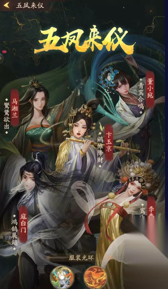 v 新增活动:五凤来仪 1、掌柜身份等级达到10级即可参与活动,活动期间可消耗指定道具【凤羽】,兑换秦淮五艳门客【五凤来仪】主题华服质量服装 2、每解锁一套服装,秦淮五艳门客将获得额外技能加成,服装技能可解锁、升级