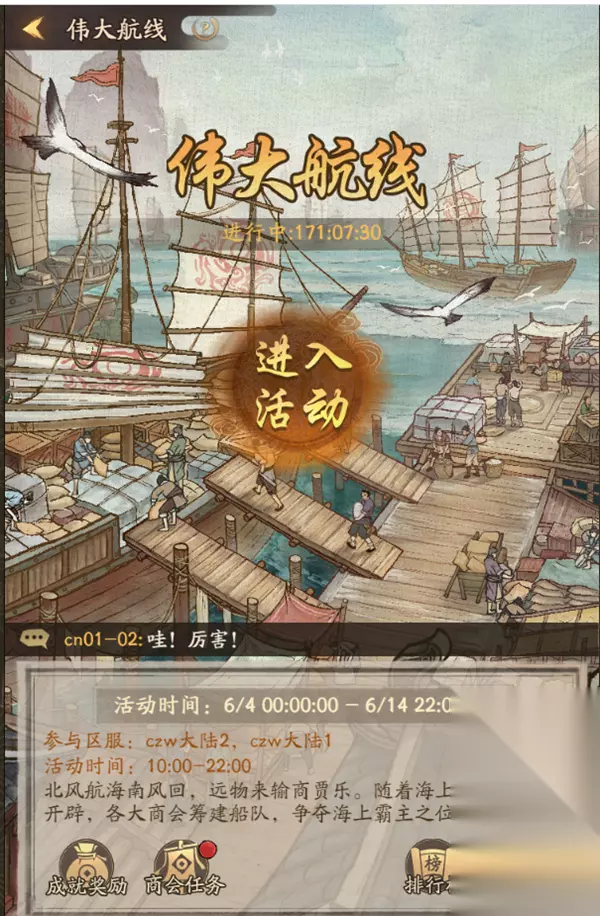 v 新增商会活动-伟大航线: 1、掌柜身份等级达到10级即可参与活动,活动期间掌柜可以在各个港口间进行贸易,通过低买高卖提高总资金,需要注意的是大航海活动需加入商会才可参与哦! 2、大航海的活动时间为每日的10点到22点,其他时间为休息期。 3、资金:掌柜开始会有一定的初始资金,掌柜可以通过贸易来改变自己的自己总量。 4、港口:一共有20个港口,每个港口各有一种特产和紧缺货物,特产固定不变,紧缺货物会重新整理,同一商会成员的所有港口库存和价格相同,前往每个港口之间的单程航行时间也相同。活动期间可以使用道具顺风帆进行加速来缩短航行时间,活动结束以后将清空资金以及未使用的顺风帆。 5、上报:每个成员进行港口贸易时均可上报该港口的紧缺物资,每个港口只能上报一次,当上报一定数量港口以后,商会成员可以领取上报奖励。所有港口的货物都将在每日22点重新整理,上报记录和次数也会在货物重新整理时重置。货物的库存还会在每日14点和18点进行补充。 6、商船:掌柜可以消耗元宝对商船进行升级,商船升级可以改变商船外观并提高利润率以获取更大的收益。 7、商会任务:活动期间每日将会解锁不同的商会任务,商会任务将由商会成员共同完成,完成任务后所有成员均可以领取相应的奖励。 8、成就奖励:活动期间达到相应活动成就即可领取成就奖励,成就奖励需要手动领取,活动结束后将无法领取且不予补发。 9、排行奖励: ①个人排行:个人总资金=持有资金+货物成本,根据个人总资金进行排行,可领取对应名次的个人奖励。 ②商会排行:商会总资金=当前成员总资金之和,根据商会总资金进行排名,参与的成员可领取对应名次的商会奖励。 ③领奖期结束后,未领取的奖励将不予补发。