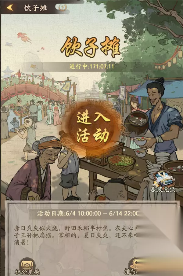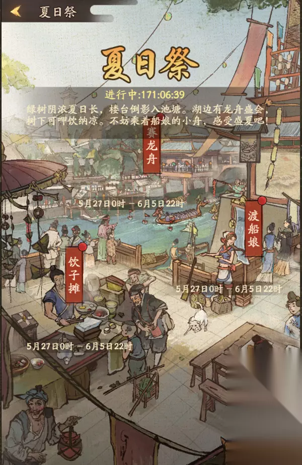 v 新增夏日祭活动:赛龙舟、饮子摊、渡船娘 炎炎烈日,去乘坐渡船,感受微风徐徐,看着远处热闹非凡的龙舟赛,再来一碗沁凉可口的消暑蜜饮,给这夏日带来一点点凉意。 1. 夏日祭共分为三个活动:赛龙舟、饮子摊、渡船娘。